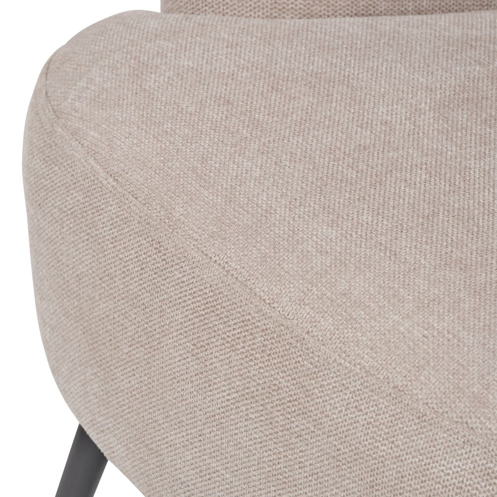 Its slim black metal legs create visual contrast and add structure, enhancing the chair’s contemporary profile. Whether styled in a bedroom corner, a relaxed lounge, or a quiet reading nook, the Aviana delivers impact without overwhelming the room. Its neutral tone blends effortlessly into minimalist or modern rustic interiors.