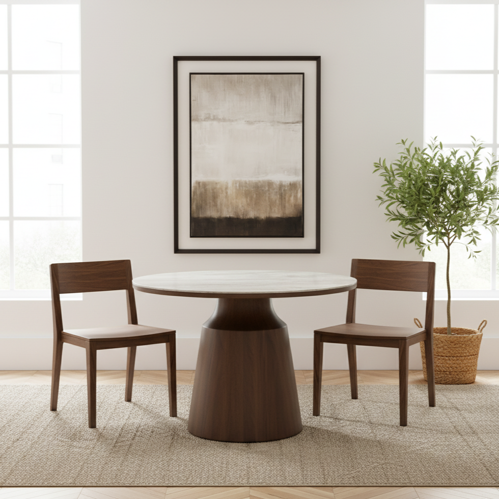 The Freya Circular 1m Dining Table brings sculptural elegance to your dining space, featuring a rich tobacco walnut base paired with a striking marbled glass top. Its round shape and bold column base create a soft, inviting silhouette that seats four comfortably.
