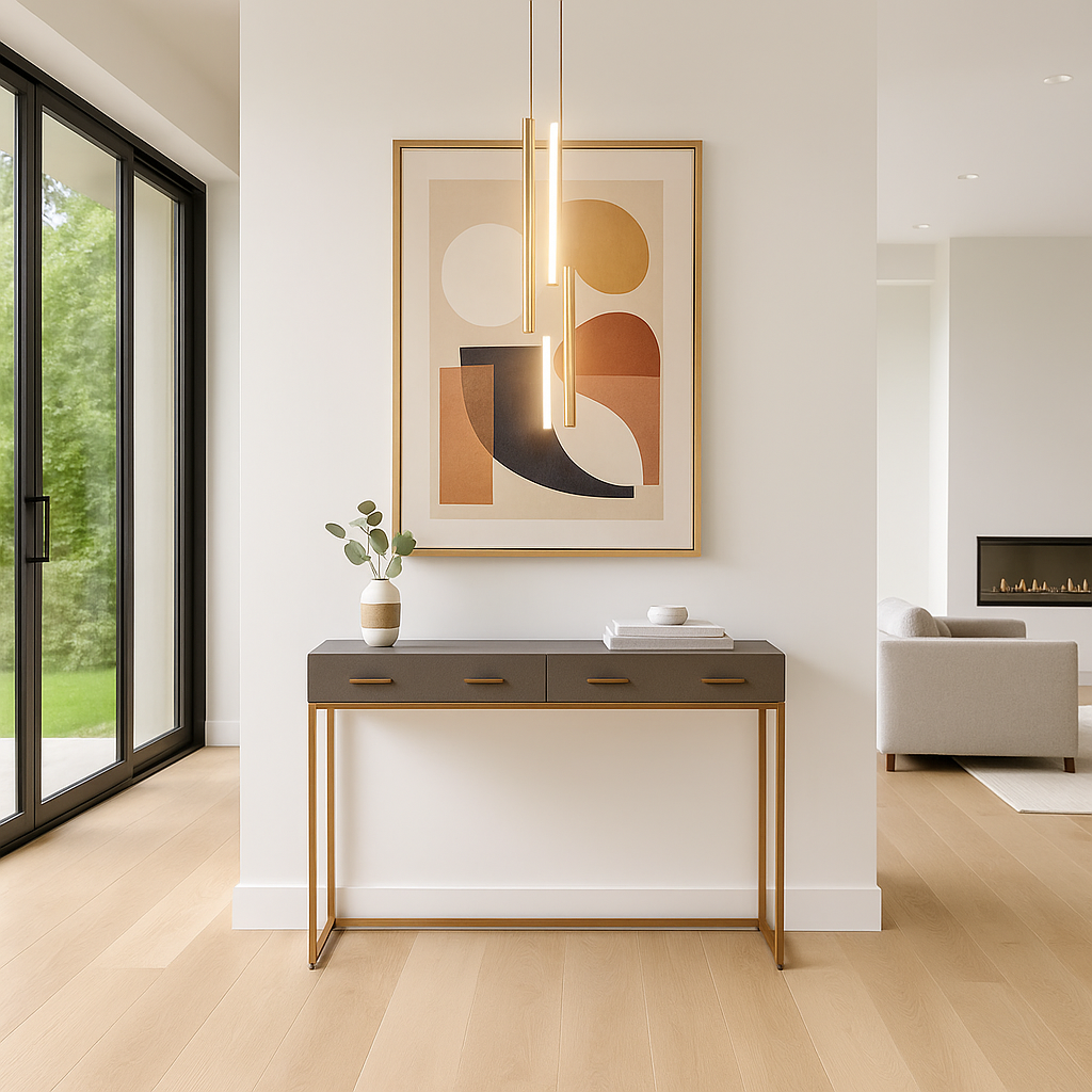 Perfect for hallways, bedrooms, dining or stylish living spaces, the console features two spacious drawers that glide smoothly on metal runners. Inside, a walnut-effect finish provides a warm contrast to the exterior, while elegant metal handles complete the look with understated charm. It’s a piece that’s designed to impress—visually striking yet highly practical for storing essentials like keys, documents, or accessories.