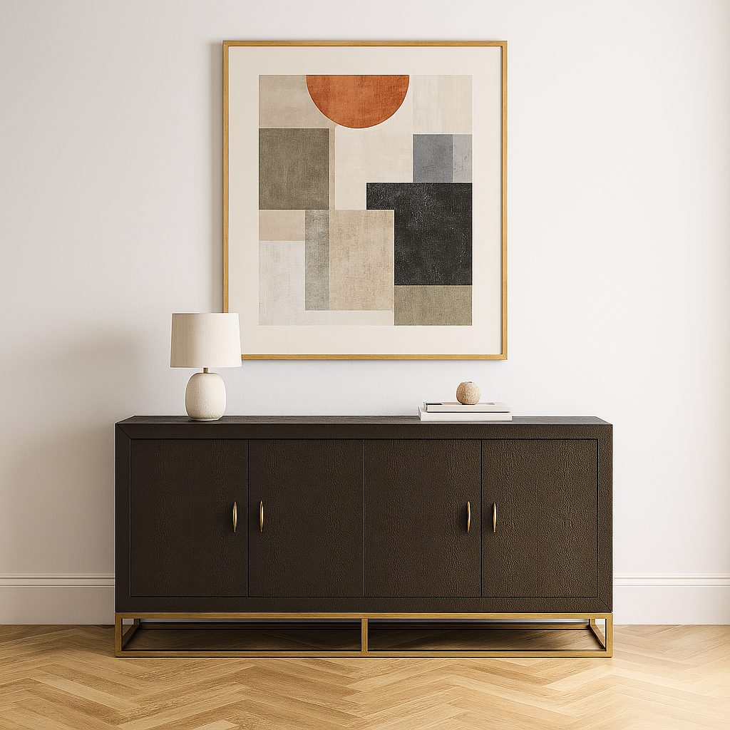The Looma Shagreen Sideboard blends bold design with everyday function, wrapped in beautifully textured faux shagreen. Its four-door front is set on a sleek brass-style base, with slim handles that add just a touch of understated glamour.