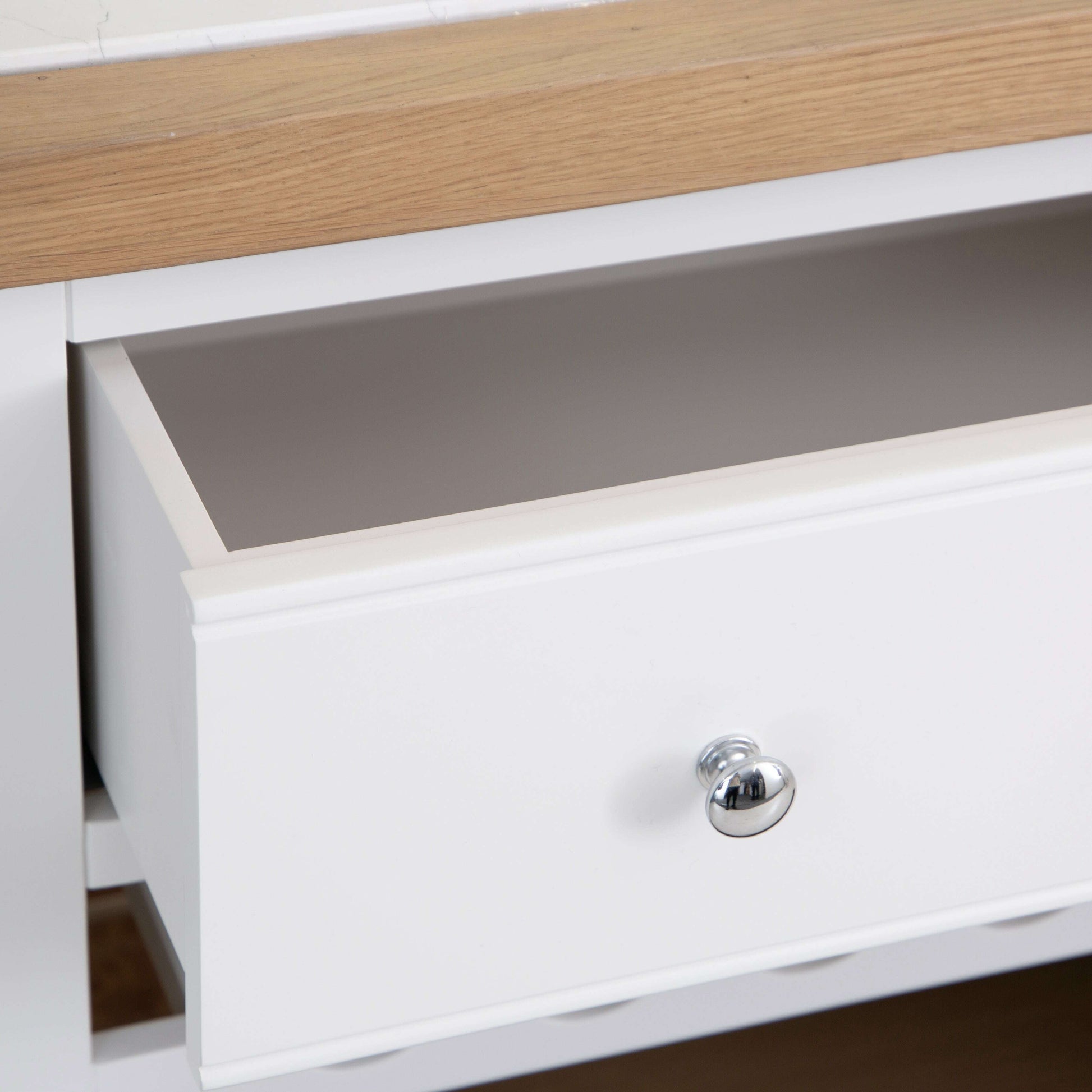 Storage is thoughtfully designed, with a spacious top drawer for utensils, cutlery, or everyday essentials, alongside a large pull-out wooden crate for additional storage. Whether you use it for fresh produce, cookware, or linens, this feature ensures a tidy and organised kitchen environment.