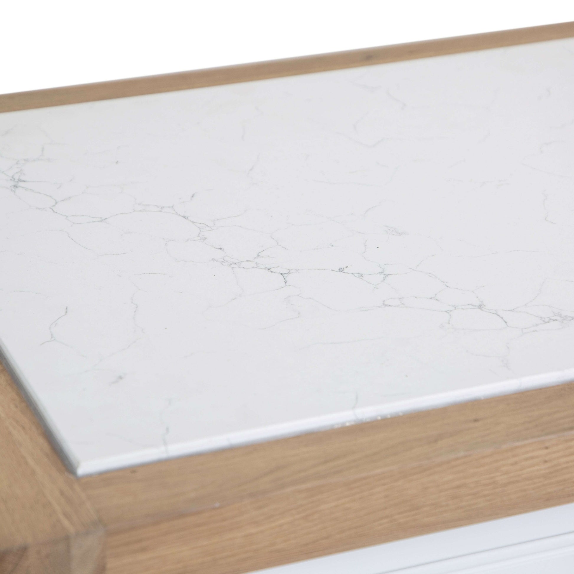 At the heart of this island is a stunning quartz workspace top, providing a durable and elegant surface ideal for meal preparation, baking, or casual dining. Its resilient nature makes it perfect for everyday kitchen tasks, offering both practicality and a luxurious touch.