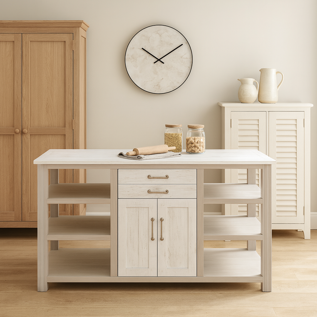 Designed with functionality in mind, this kitchen island offers two spacious cupboards with adjustable shelving, perfect for organising cookware, pantry items, or dining essentials. The wide drawers provide additional storage, ensuring utensils and other kitchen accessories are always close at hand. Open shelving on either side enhances the island’s practicality, creating the ideal space for displaying crockery, decorative items, or cookbooks. Its versatile design makes it the perfect addition to kitchens of all sizes.