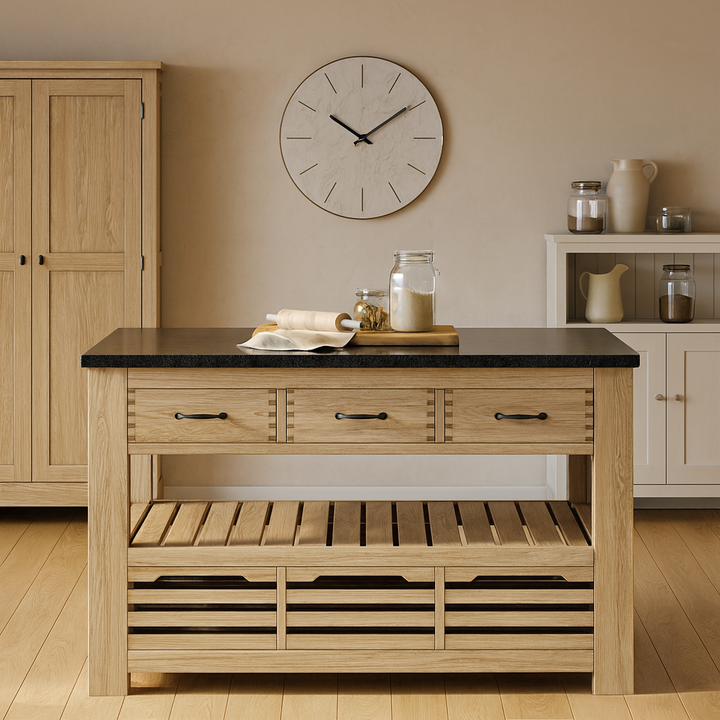 Oxford Three-Drawer Kitchen Island | Compact Solid Oak & Granite Style