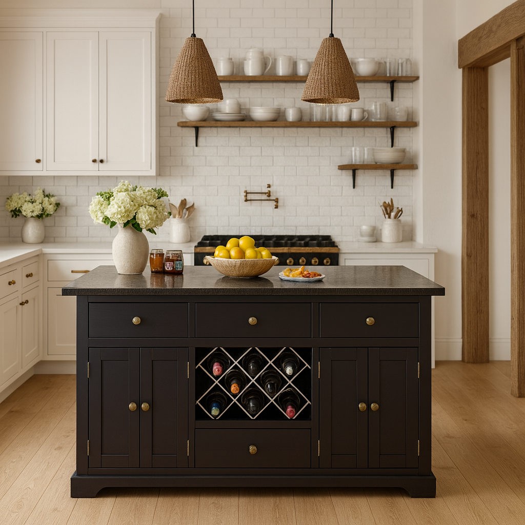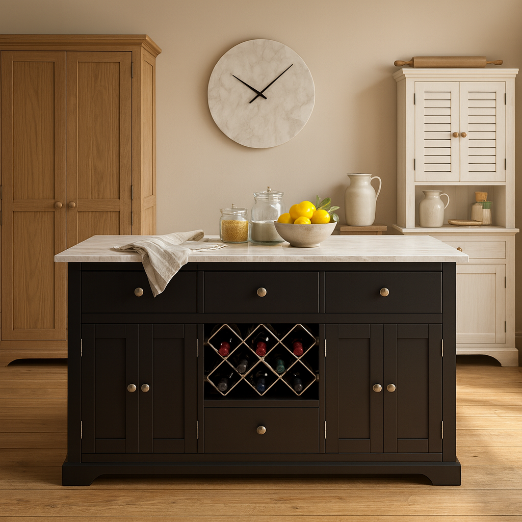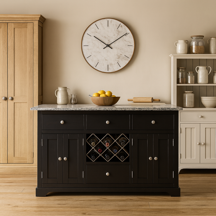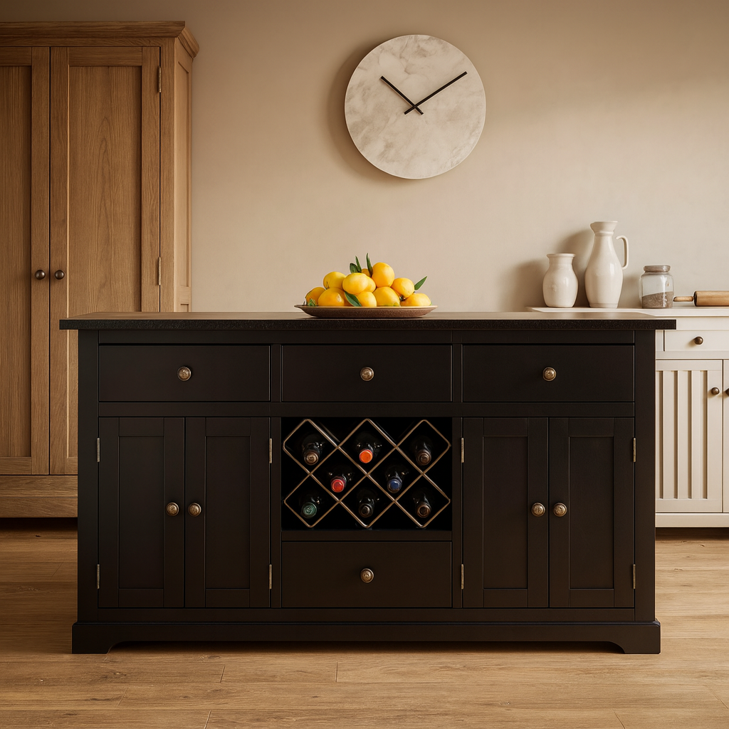 The Windham Black Painted Large Kitchen Island is a bold yet timeless centrepiece, designed for modern family living. With a choice of stylish worktops and customisable features, it’s ideal for food prep, casual dining, and keeping your kitchen beautifully organised.