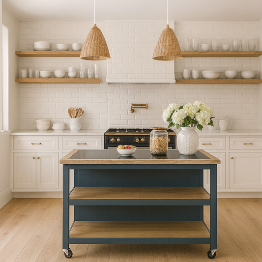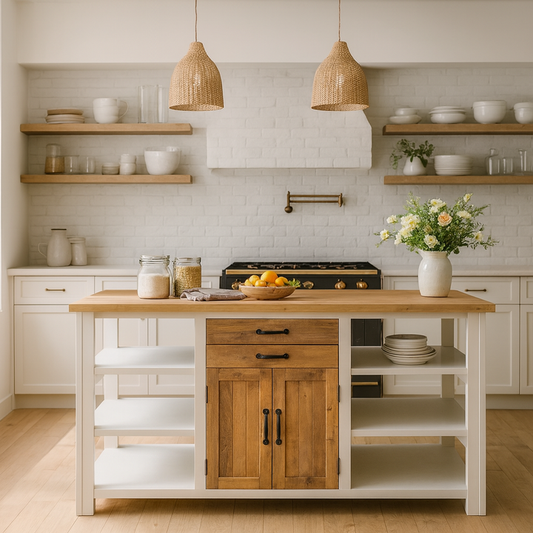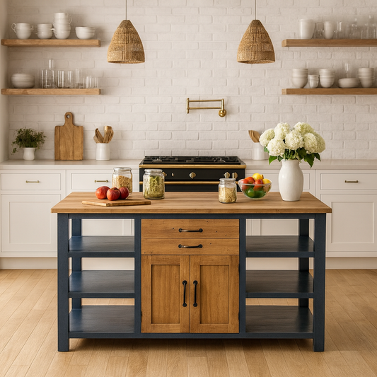 Our kitchen islands are crafted from solid oak, reclaimed wood, and painted finishes, offering durability, elegance, and timeless style.