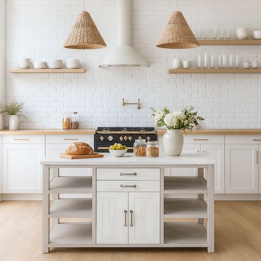 Our kitchen islands are crafted from solid oak, reclaimed wood, and painted finishes, offering durability, elegance, and timeless style.