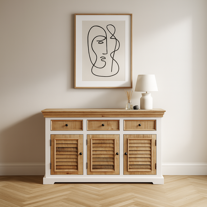 With three drawers and three doors, it offers generous storage wrapped in timeless style. Perfect for living or dining spaces, this sideboard adds both charm and practicality to your home.