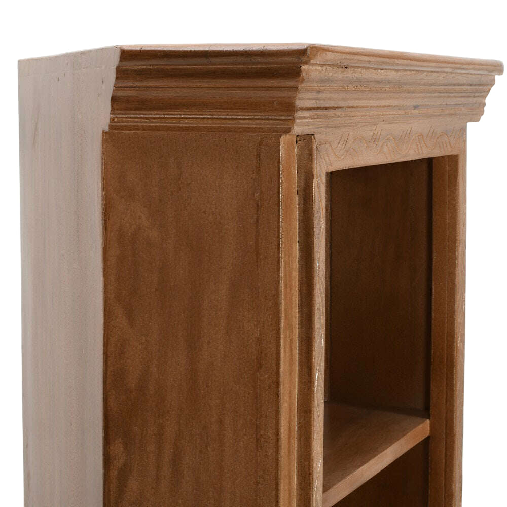 Thoughtfully designed for both display and storage, this bookcase features three spacious open shelves—perfect for showcasing books, cherished keepsakes, or decorative accents. Below, a generously sized cupboard with a closed-door design provides concealed storage, helping to keep your space neat and organised. The cupboard door is adorned with an intricately hand-carved pattern, making it a true statement of craftsmanship and attention to detail.