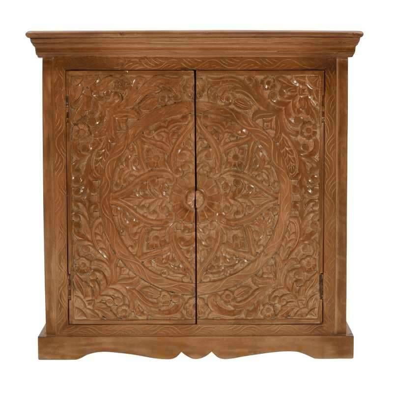 Handcrafted Eco-Sourced Solid Wood Storage with Intricate Carvings and Whitewash Finish – Artwork Mango Wood Sideboard with 2 Doors