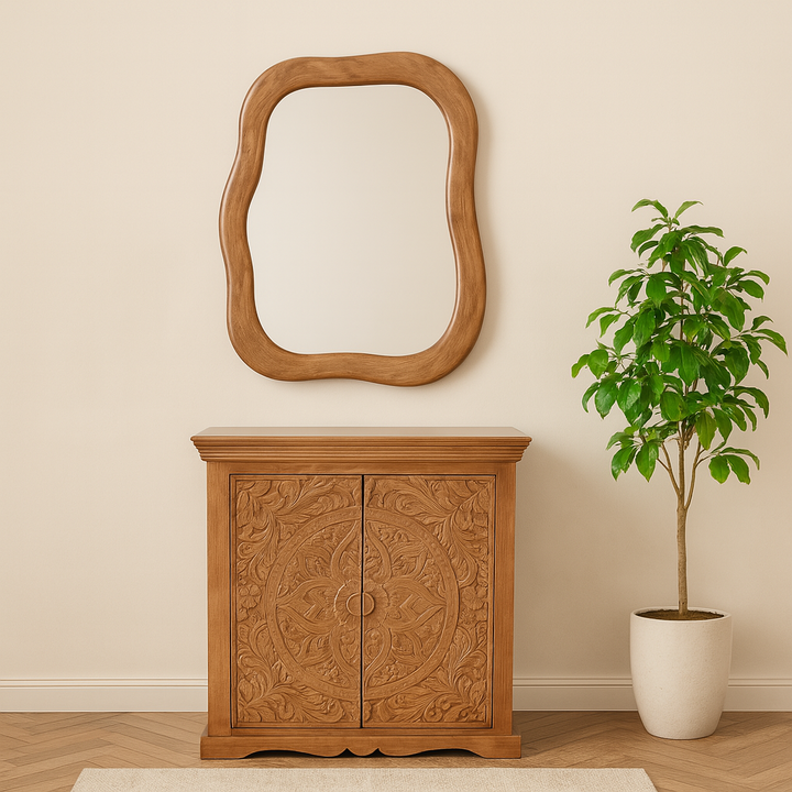 The Artwork Mango Wood Sideboard with 2 Doors is a charming, handcrafted piece made from 100% eco-sourced solid mango wood. Its front features delicate carved detailing, beautifully highlighted by a soft whitewash finish that brings out its rustic, artisanal character.