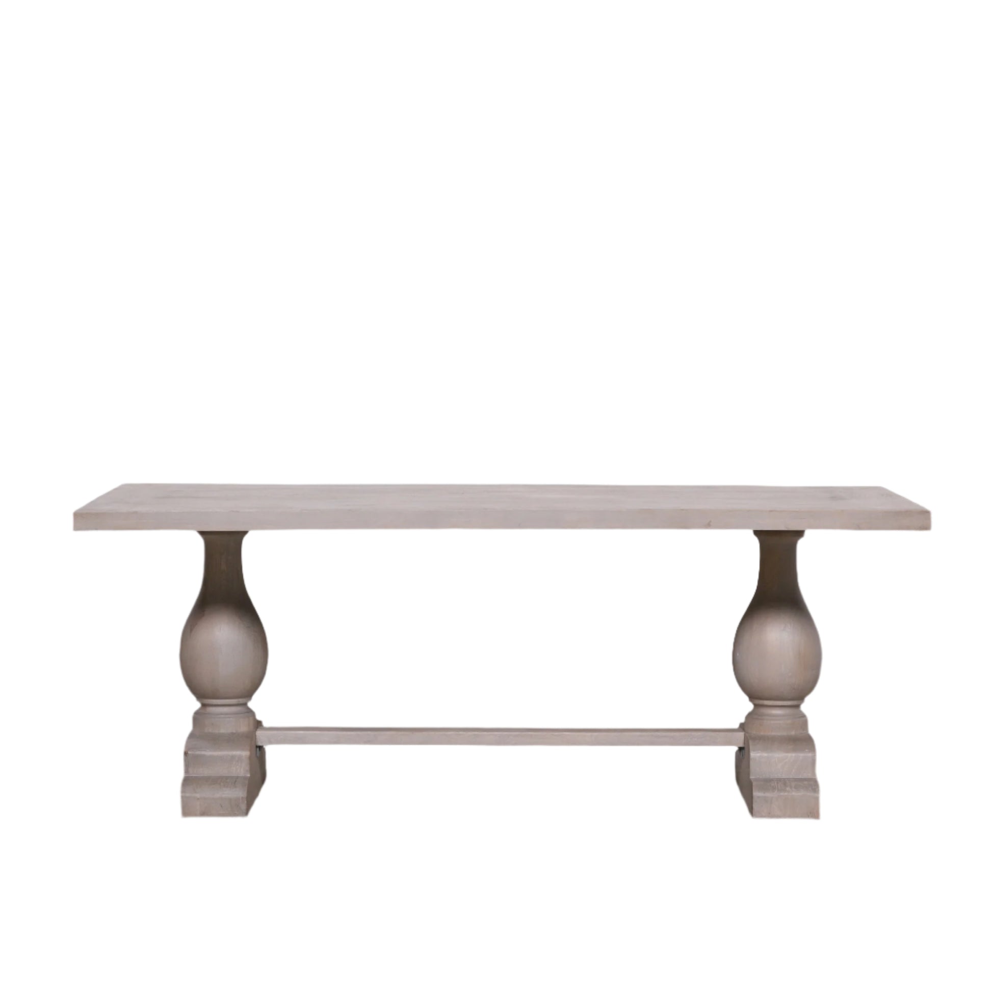 The Blanche 210cm Dining Table blends traditional charm with refined craftsmanship. Handcrafted from solid bleached mango wood and finished in a light grey rustic wash, this elegant table features intricately carved column pedestal bases that make a timeless statement in any dining space.