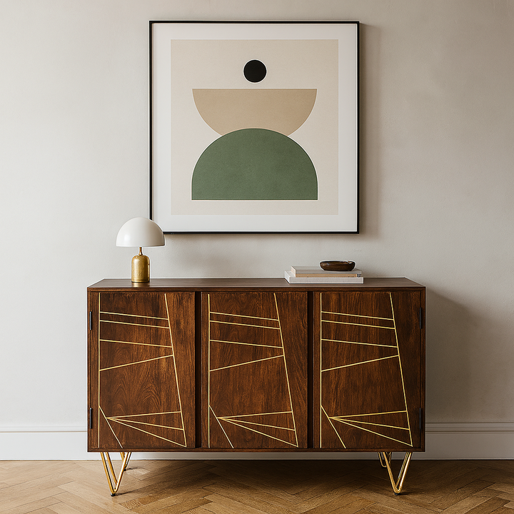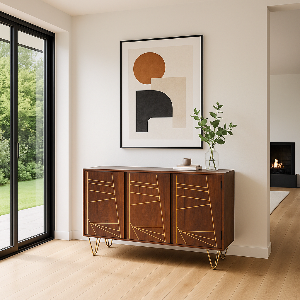 The Dark Gold Large Sideboard blends rich materials with refined style, handcrafted from solid mango wood in a deep walnut finish. Its front panels are adorned with bold gold inlays in an abstract design, adding a touch of modern glamour to its retro-inspired silhouette.