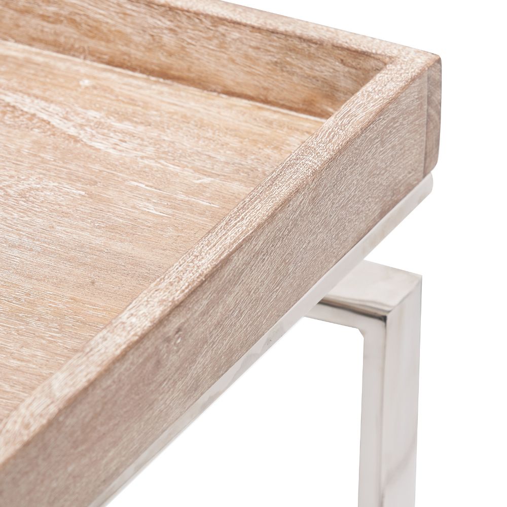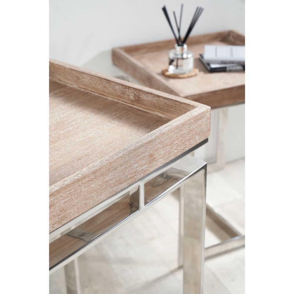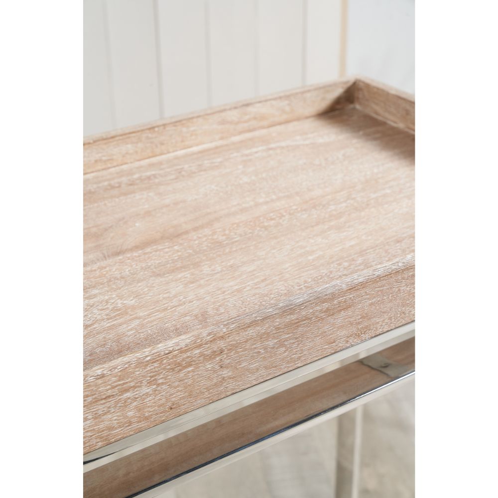 Bring modern elegance into your hallway or living space with the Evelyn Console Table. Crafted in India from solid mango wood and stainless steel, this striking piece pairs a warm, antiqued wood top with a polished silver frame for a beautifully balanced contrast of textures.