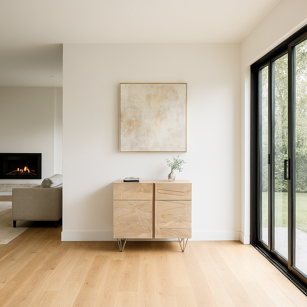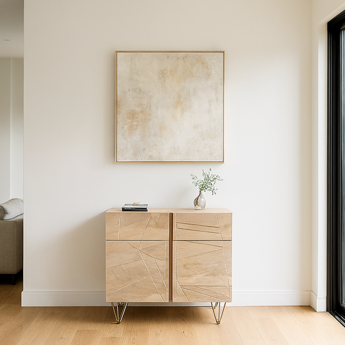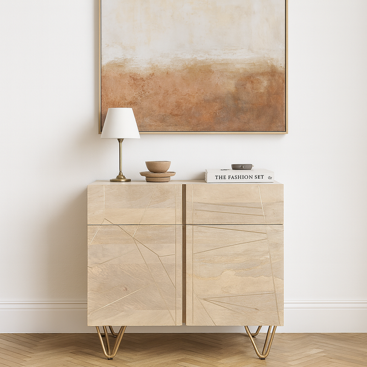 The Light Gold 2 Door Medium Sideboard brings a perfect balance of modern elegance and retro charm to your home. Crafted from solid mango wood in a light natural finish, it features striking gold metal inlays in an abstract design, adding a refined contemporary touch.