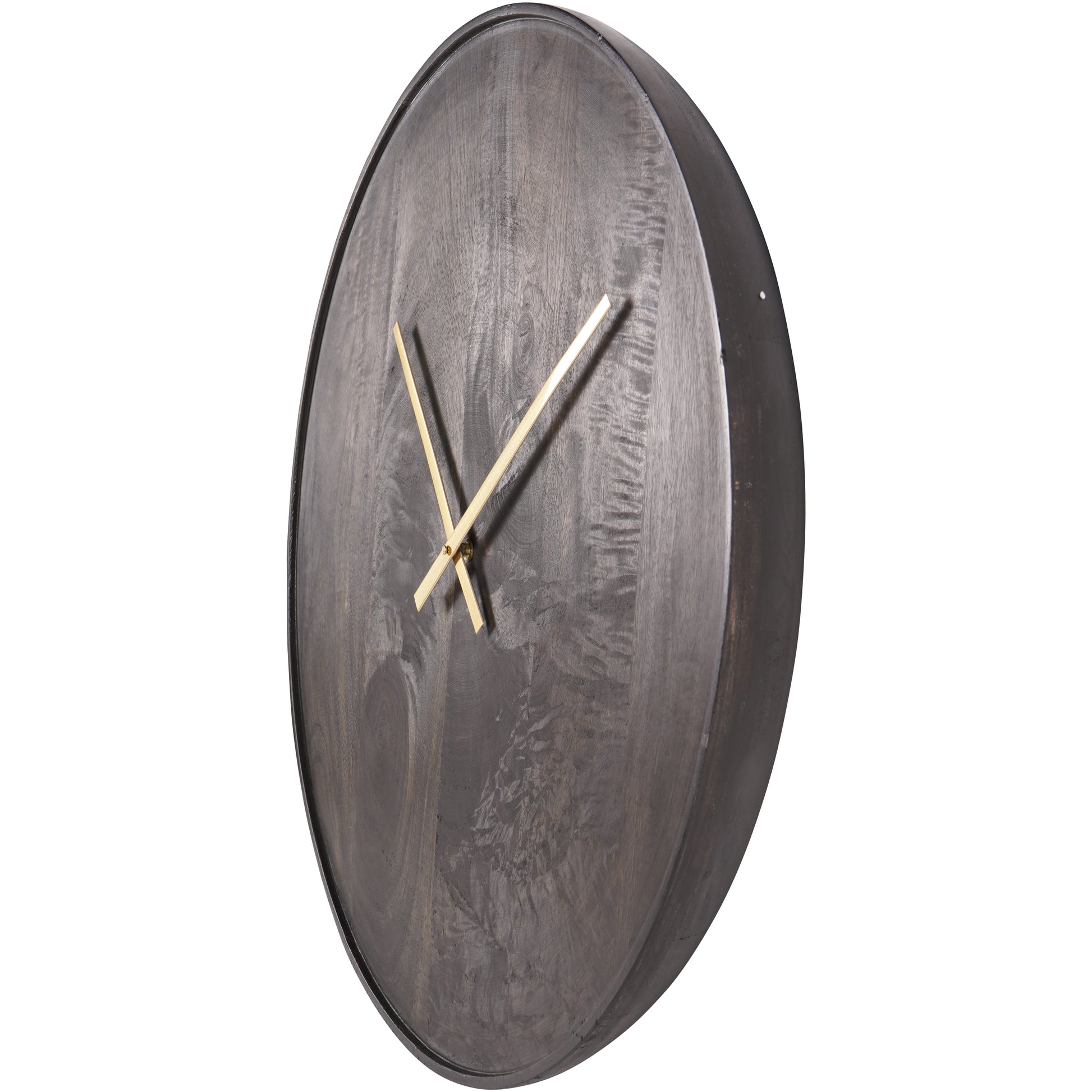 Antique brass hands glide across the dark surface, offering a warm metallic accent that complements the wood’s tone and adds a refined edge. The minimalist face keeps the look clean and modern, allowing the material and silhouette to take centre stage. It’s an elegant balance of craftsmanship and restraint, ideal for understated interiors.