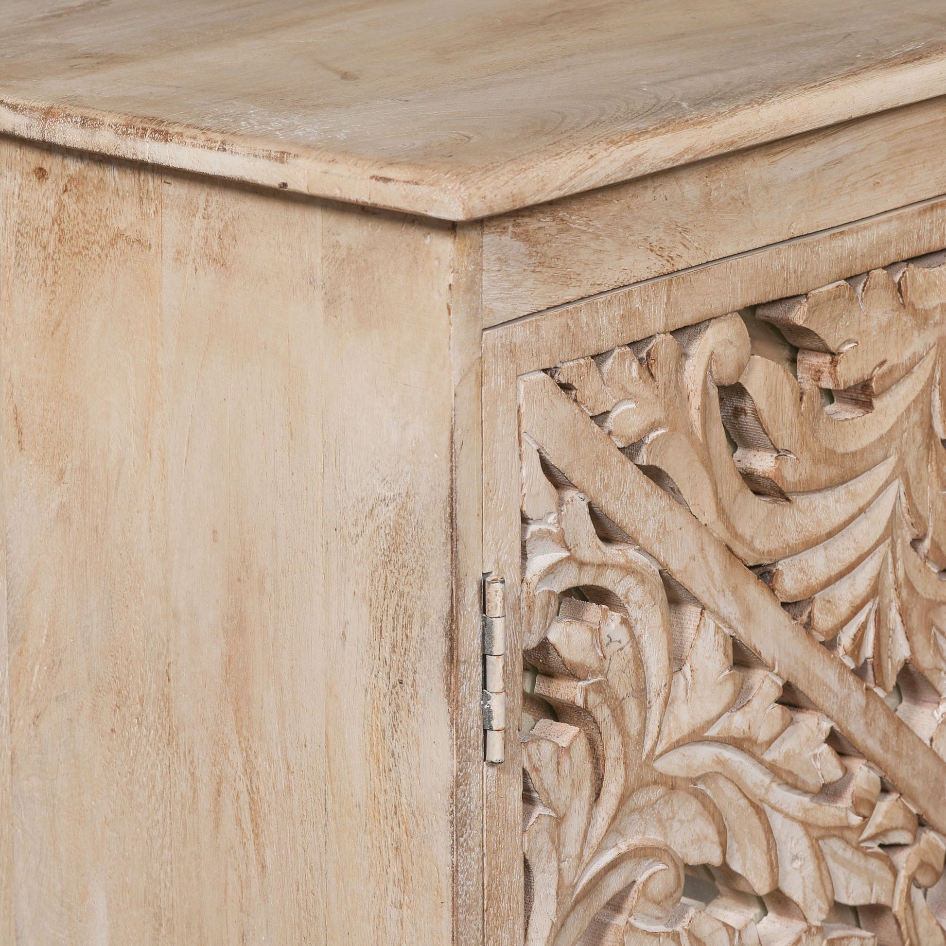 Elevate your space with the Mango Wood Ornate Carved Mirror Door Sideboard. Handcrafted from solid mango wood in a light rustic finish, it features intricately carved doors with mirrored back panels for a touch of artisanal elegance.
