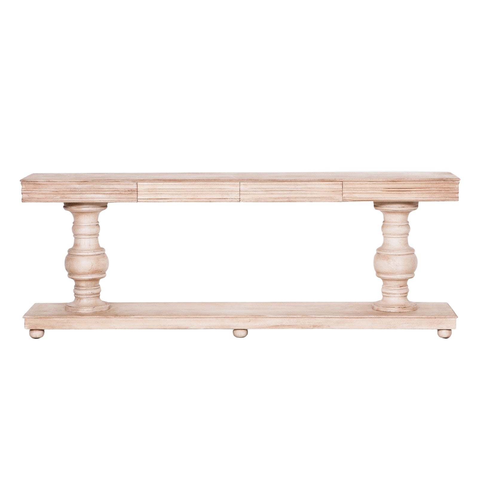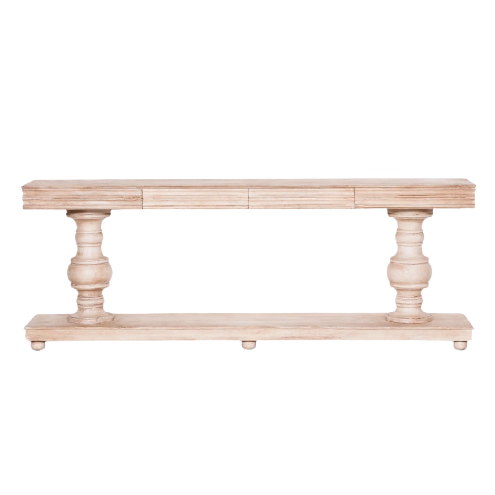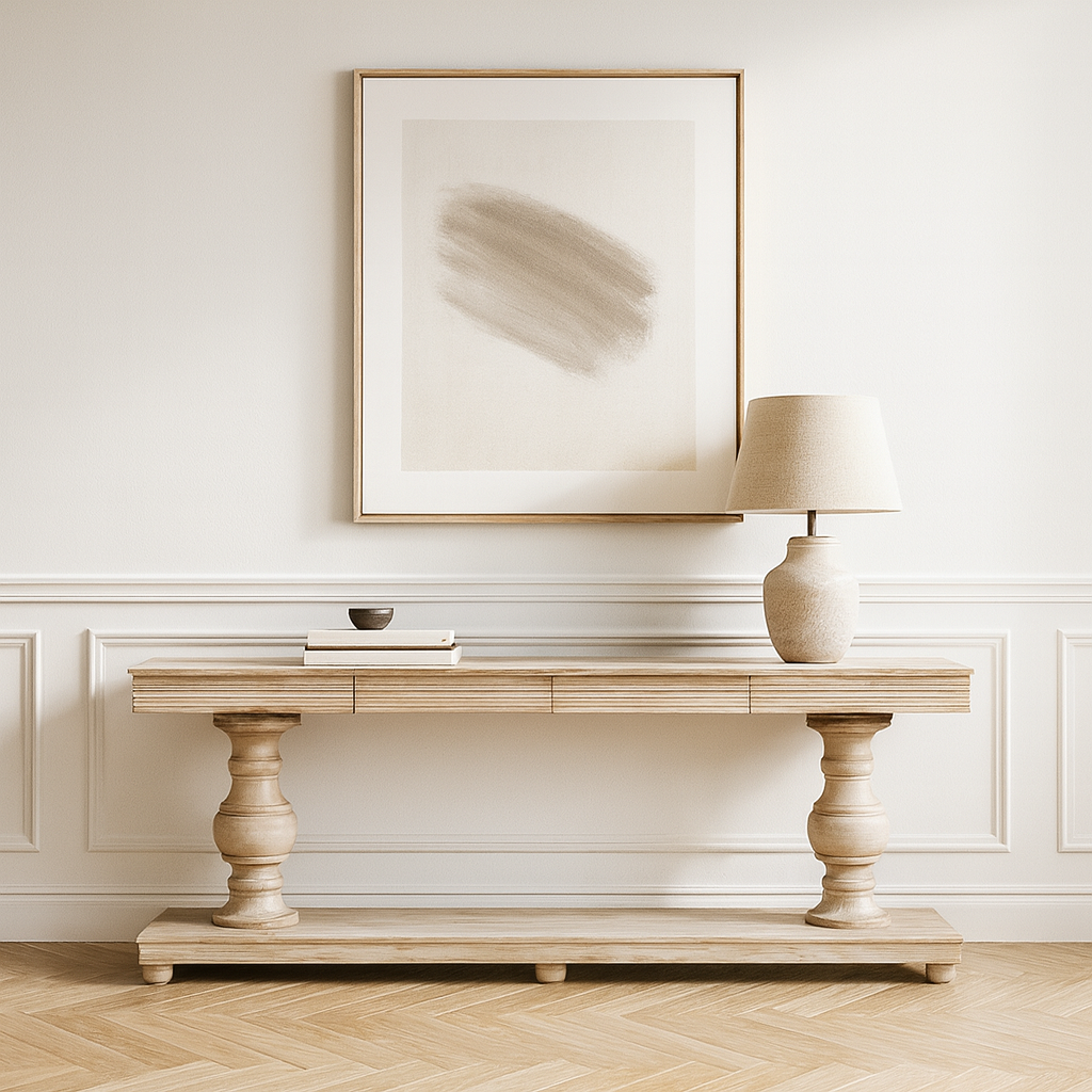 Designed to blend beauty with practicality, this console includes two generously sized drawers for keeping essentials discreetly stored and surfaces clutter-free. The expansive tabletop provides room for displaying artwork, florals, lighting, or collected accents, making it a stylish anchor in larger rooms. Its classic proportions and fluted detail evoke heritage craftsmanship with a fresh, rustic edge.