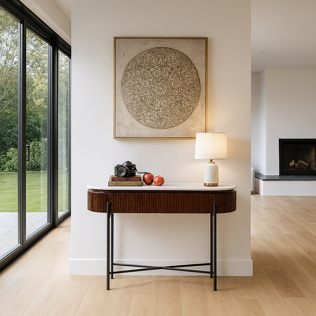 The Opal Mango Wood Console Table is a refined blend of elegance and craftsmanship, handcrafted from solid mango wood with a luxurious real white marble top. Its fluted detailing adds texture and depth, while the sleek metal legs lend a contemporary touch.