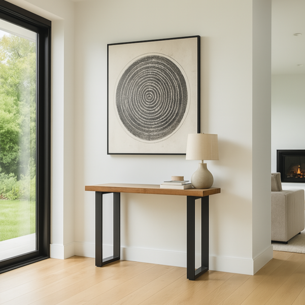 Slim graphite-coloured iron legs add contrast and industrial flair, making it a versatile accent for hallways, living spaces or entryways. A standout piece with timeless appeal, it’s ideal for showcasing lamps, décor, or everyday essentials.