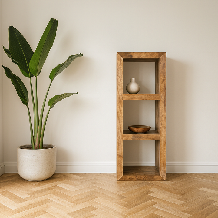 Whether used as a slim bookcase, vertical side display, or compact room divider, this versatile piece blends beautifully into modern, rustic, or Scandinavian-inspired interiors. The open-back cubes keep the look light and airy, while the solid wood build ensures durability and lasting appeal. It's equally suited to living rooms, bedrooms, hallways or home offices.