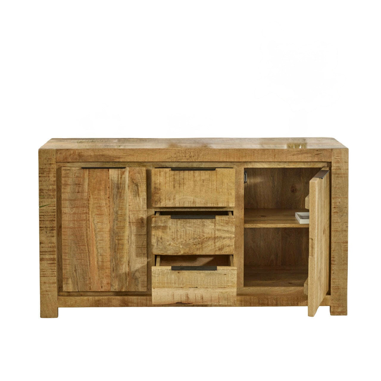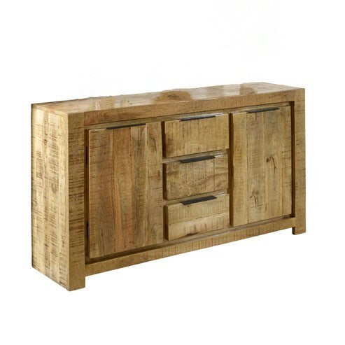 The rough-sawn lacquered finish enhances the natural beauty of the mango wood, bringing out its unique grain patterns and textures. Each piece is individually crafted, ensuring that no two sideboards are exactly alike, adding a distinctive and organic touch to your décor. Complementing the warm wood tones, the sleek metal handles introduce a subtle industrial contrast, elevating the overall aesthetic with a modern edge.