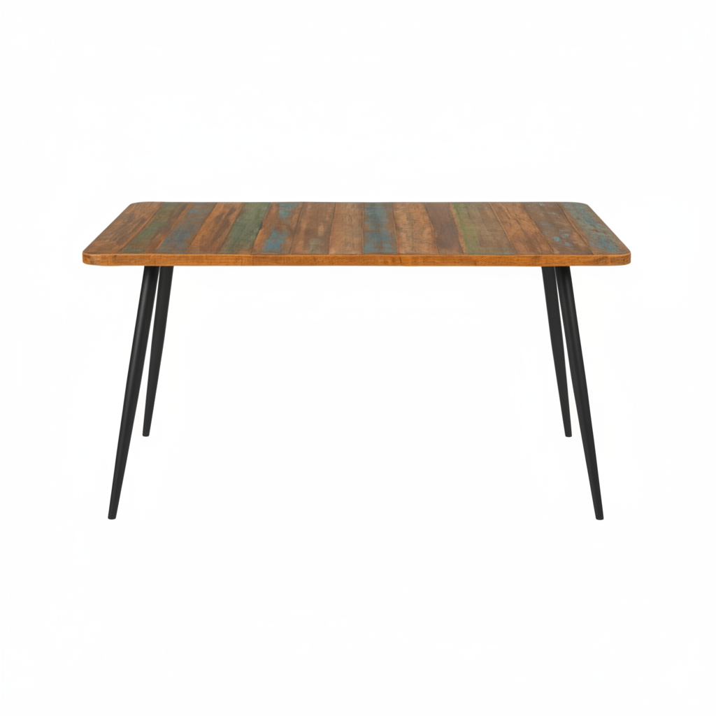 Supported by strong and durable iron legs, this table strikes a harmonious balance between rustic charm and industrial flair. The sturdy iron base is designed to provide lasting stability, while its sleek finish contrasts beautifully with the vibrant reclaimed wood top. Perfect for both everyday family dining and hosting dinner parties, this generously sized table offers ample space for all occasions, making it both functional and visually striking.