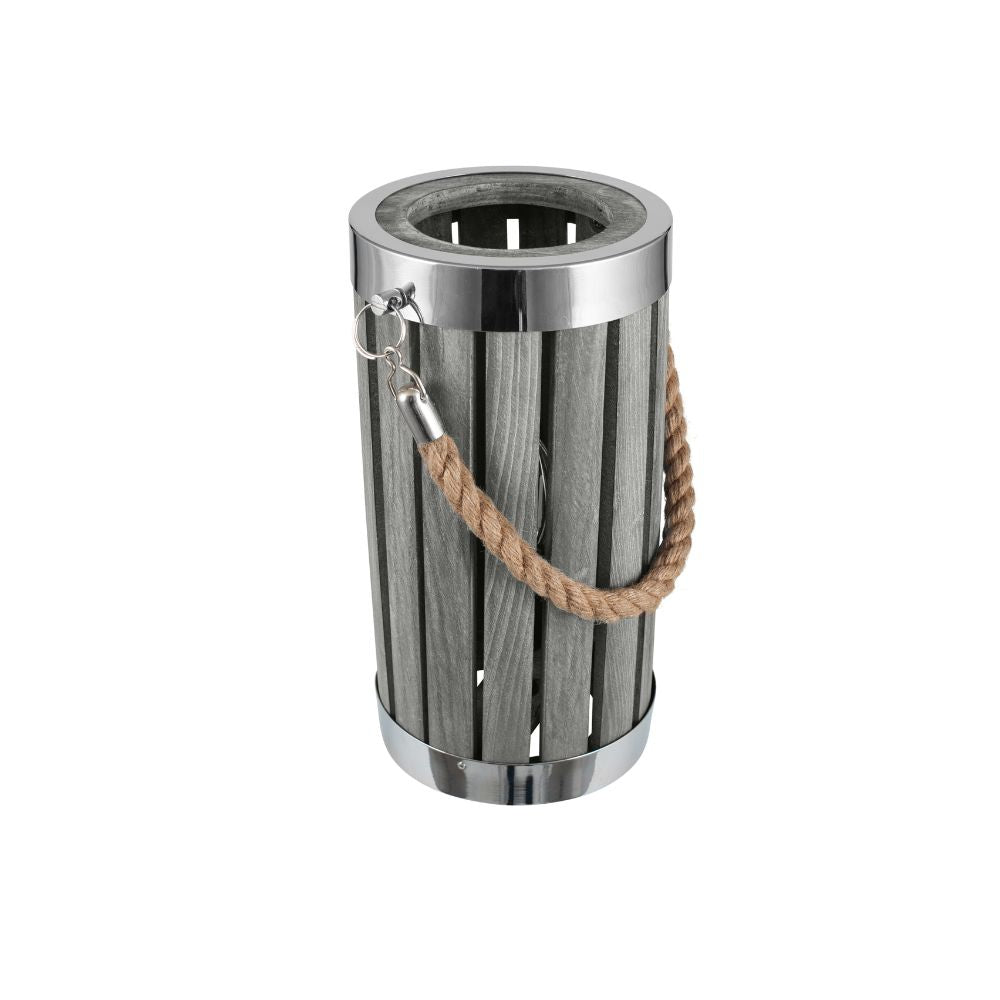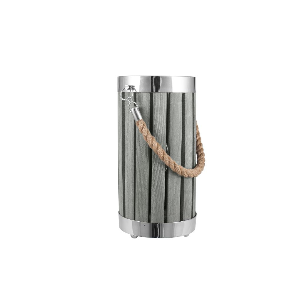 Silver metal accents add a polished contrast, enhancing the natural wood tones and elevating the lamp’s overall finish. A thick rope handle completes the look, offering an authentic maritime touch that nods to traditional coastal décor. This combination of tactile materials makes the Austell lamp as decorative as it is functional.
