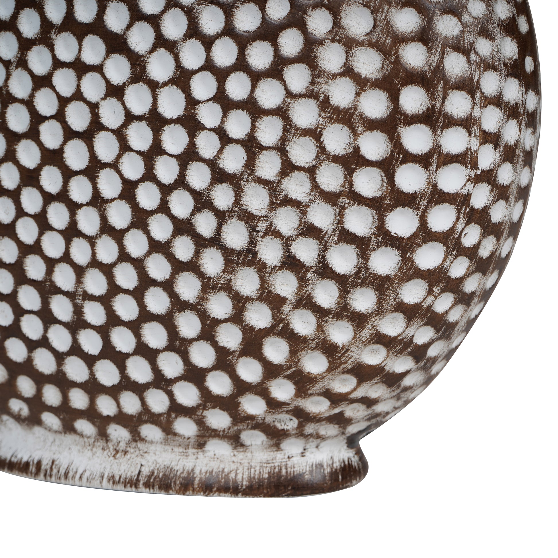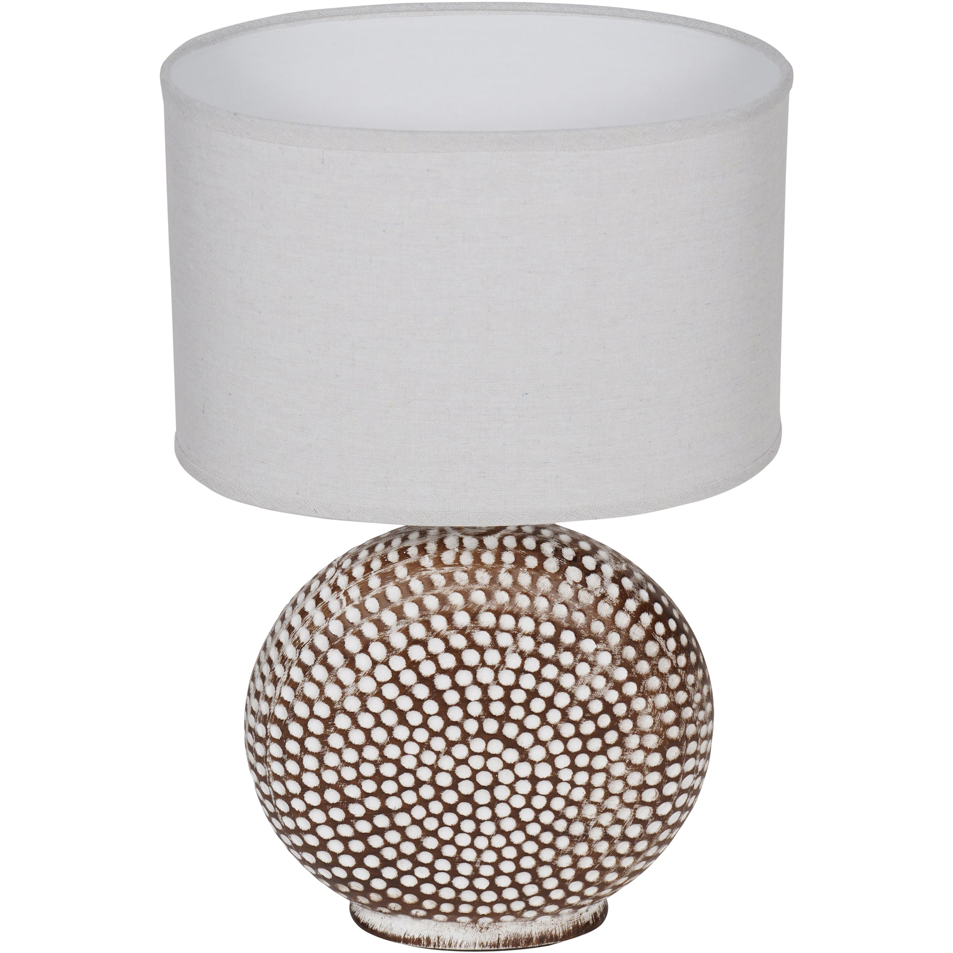 The Chariot Ceramic Round Table Lamp is a beautifully tactile accent crafted with artisanal care. Made from ceramic, its flat drum silhouette features gentle curves and delicate round dimples, each one brought to life through a hand-painted finish in soft antique cream and earthy brown tones. The result is a textured, one-of-a-kind piece that brings natural warmth and character to any room.