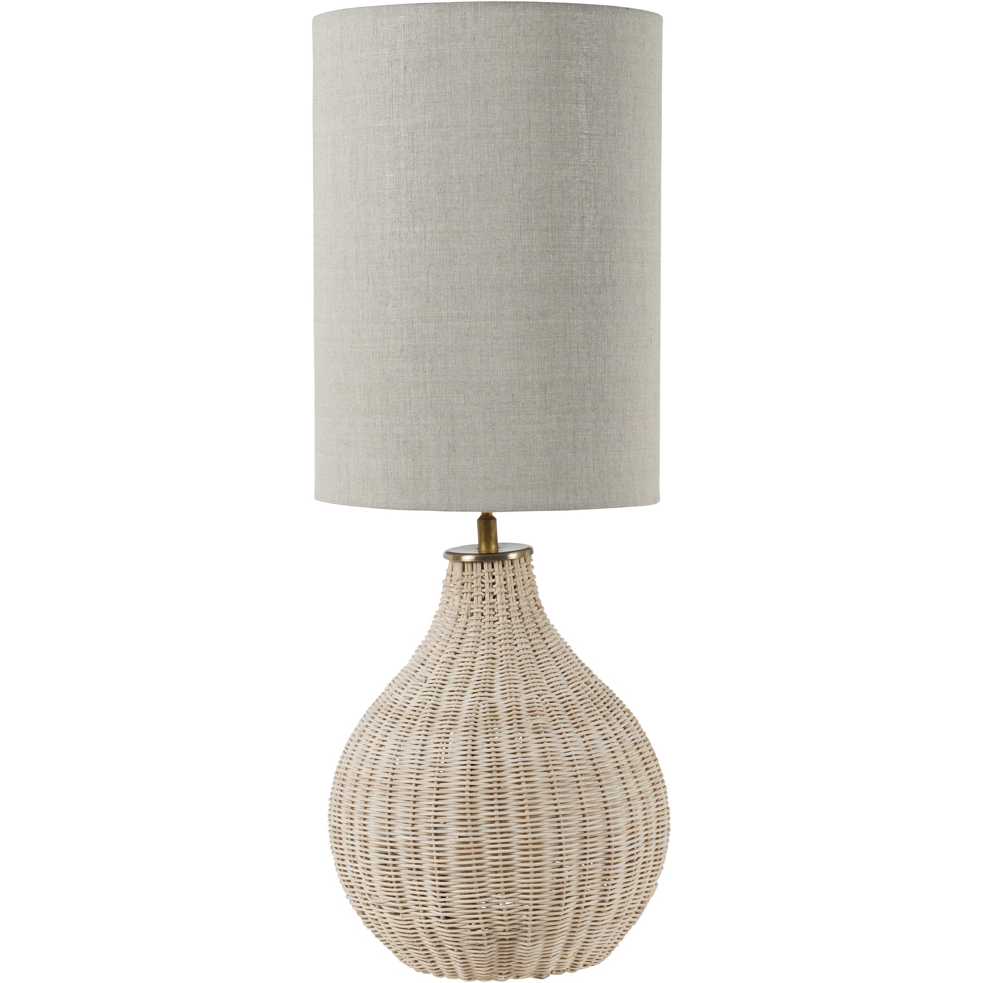 A tall cylindrical shade in a soft linen mix fabric complements the rattan base, offering a refined contrast in both form and texture. The shade gently diffuses the light, casting a warm, ambient glow that's perfect for cosy evenings or quiet reading sessions. Together, the materials and proportions balance elegance with ease, making the lamp as functional as it is beautiful.