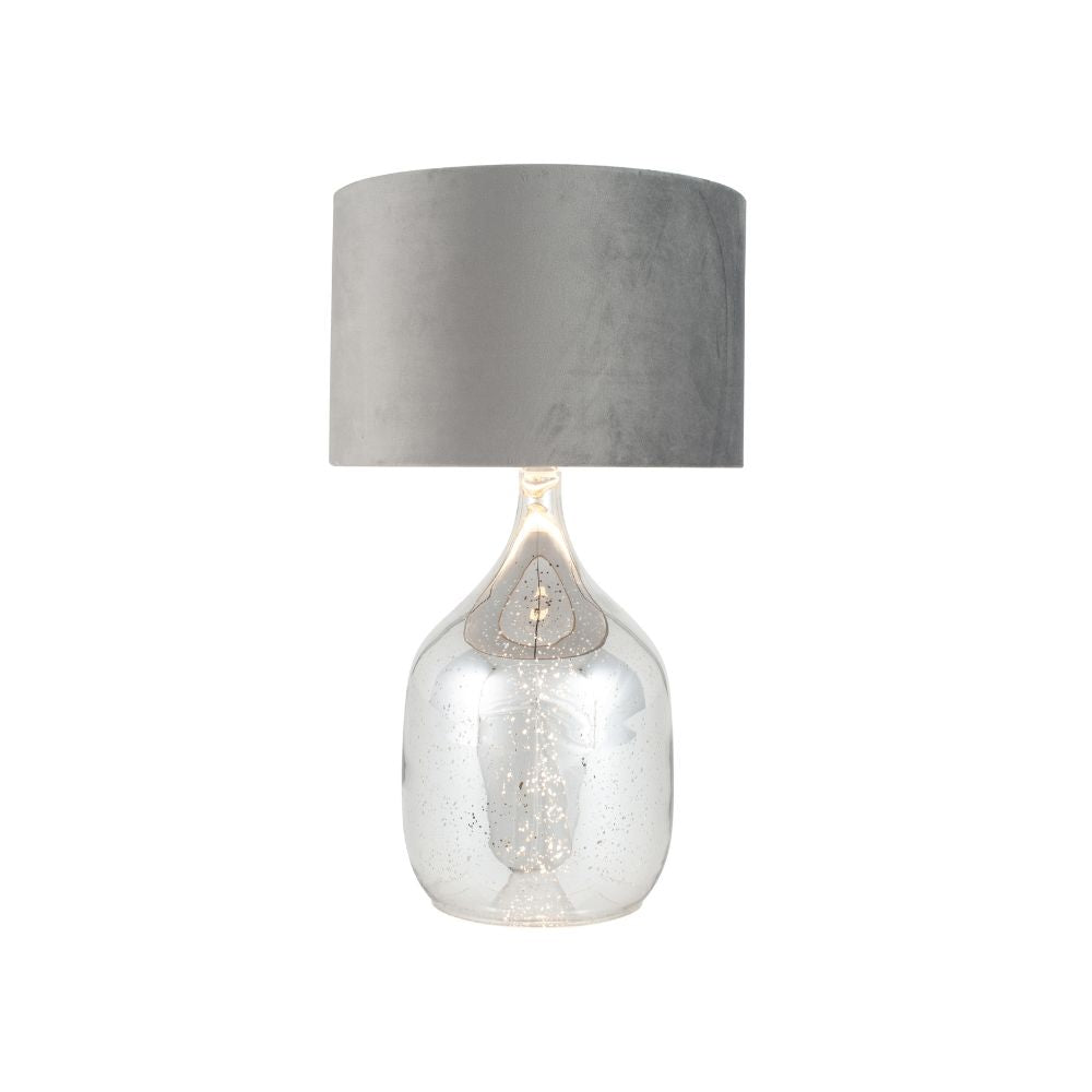 Add modern glamour to your space with the Stellar Mercurial Dual Light Table Lamp. Featuring a shimmering silver glass base with a unique mercurial finish, this lamp offers ambient glow from both the base and the stylish grey velvet shade.