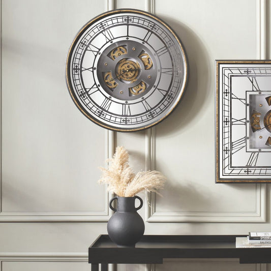 Wood and Mirror Antique Gold Working Cog Round Wall Clock