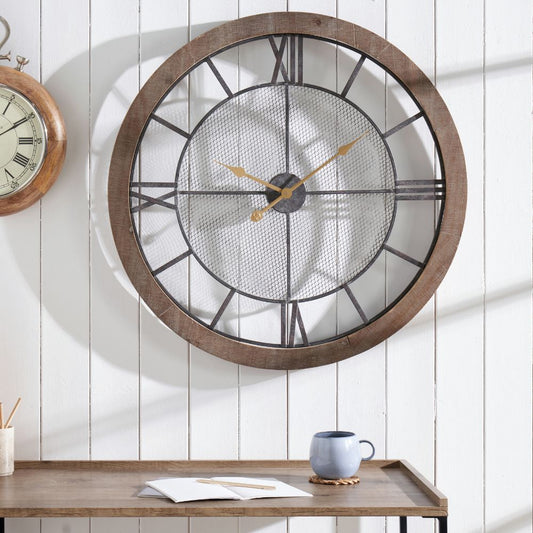 Natural Wood and Black Metal Mesh Round Wall Clock