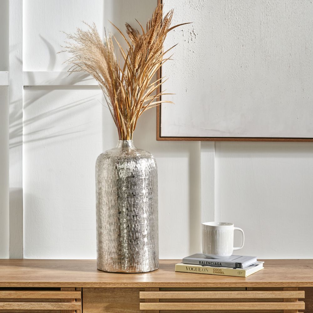 The rich texture and lustrous finish offer subtle glamour, whether placed in a minimalist setting or layered with eclectic accents. This vase serves as both a sculptural object and a stylish base for dried or faux botanicals. Its tall, narrow form adds height and presence without overwhelming your décor.