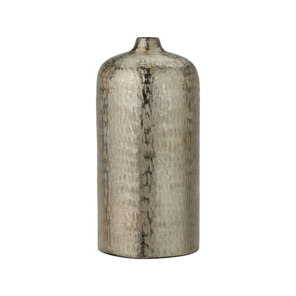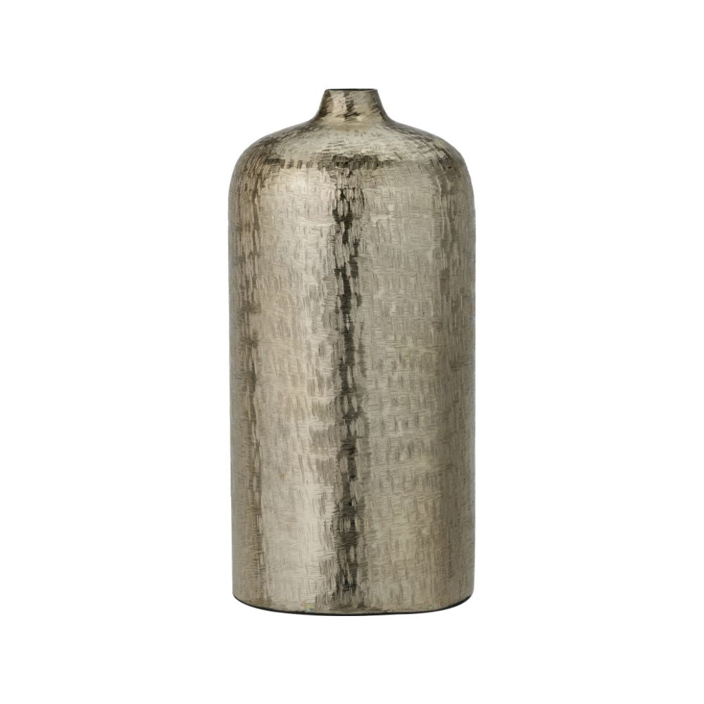 Elevate your décor with this tall hammered metal vase, available in a striking silver or gold finish. Handcrafted in India, it features a beautifully textured surface and elegant shape that brings depth and visual interest to any setting. The metallic tones add a refined shimmer, perfect for modern, luxe, or eclectic interiors.