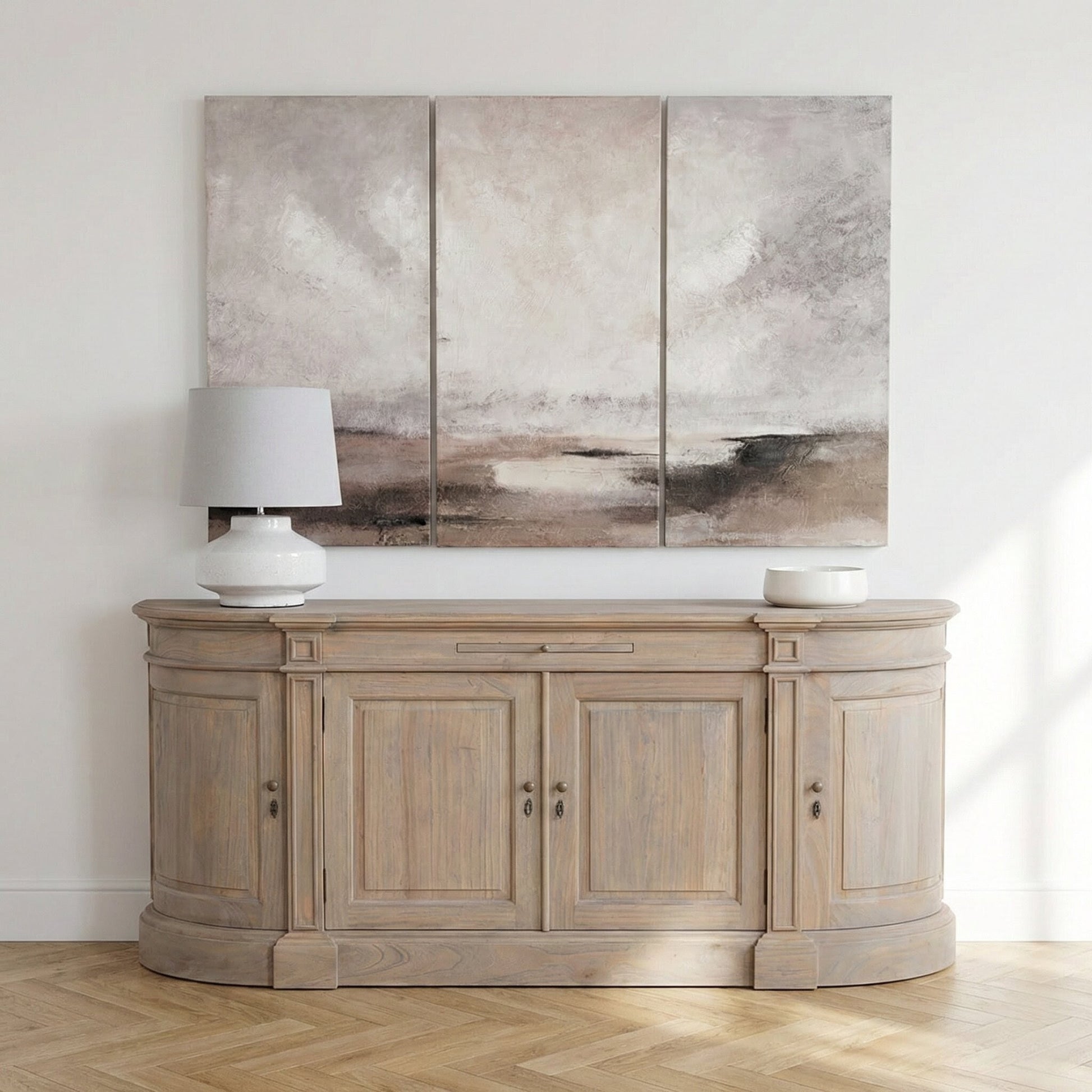Measuring 195.5cm wide, this sideboard offers substantial storage space while making a refined visual statement. The gently distressed finish highlights the grain of the wood, enhancing its natural beauty and vintage character. Whether styled with candelabras, mirrors, or ceramics, it becomes a true focal point in any setting.
